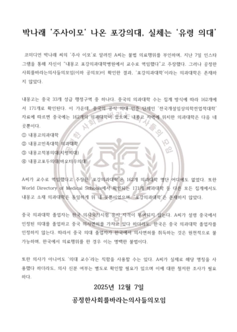 최근 연예계와 의료계 모두를 뜨겁게 달군 사건이 있습니다. 바로 박나래 주사이모 논란과 포강의대 유령의대 의혹인데요. 단순한 연예 뉴스가 아니라, 불법 의료 시술, 허위 학력, 그리고 공신력 없는 의학 교육기관에 대한 문제까지 얽혀 있어 논란이 확산되고 있습니다.